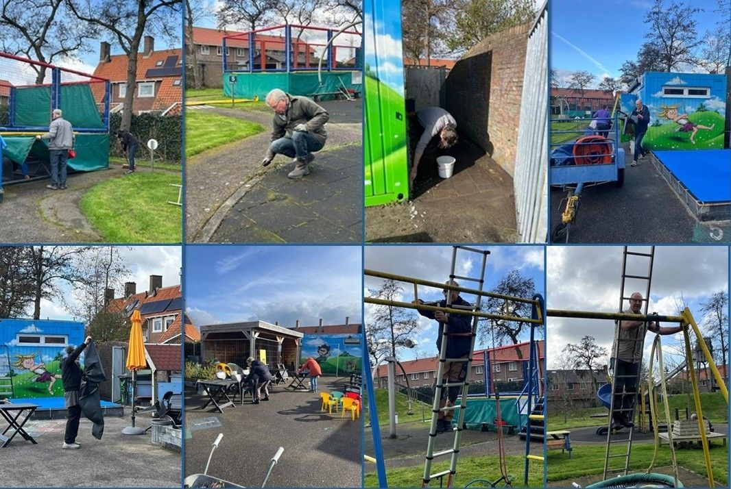 In aanloop naar Koningsdag 2024 hebben Wim en Aart -soms met hulp van Jan en/of Dirk- veel werk verricht in de speeltuin. Tijdens NLdoet en op een zaterdag in april kregen de mannen hulp van bestuursleden en enkele vrijwilligers.